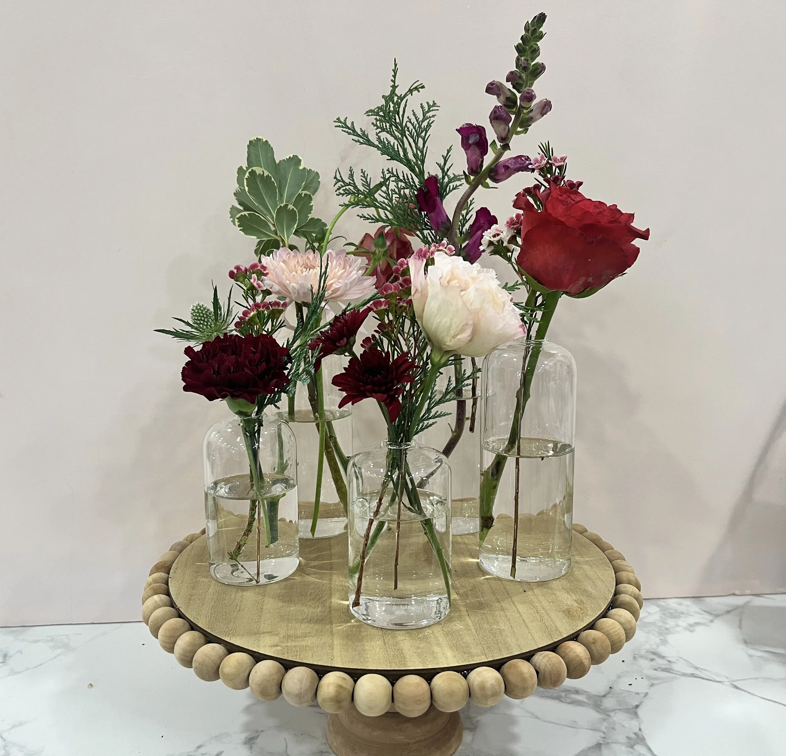 Decorative arrangement of assorted flowers in glass vases on a wooden tray with beaded edge, placed on a marble surface against a plain wall.